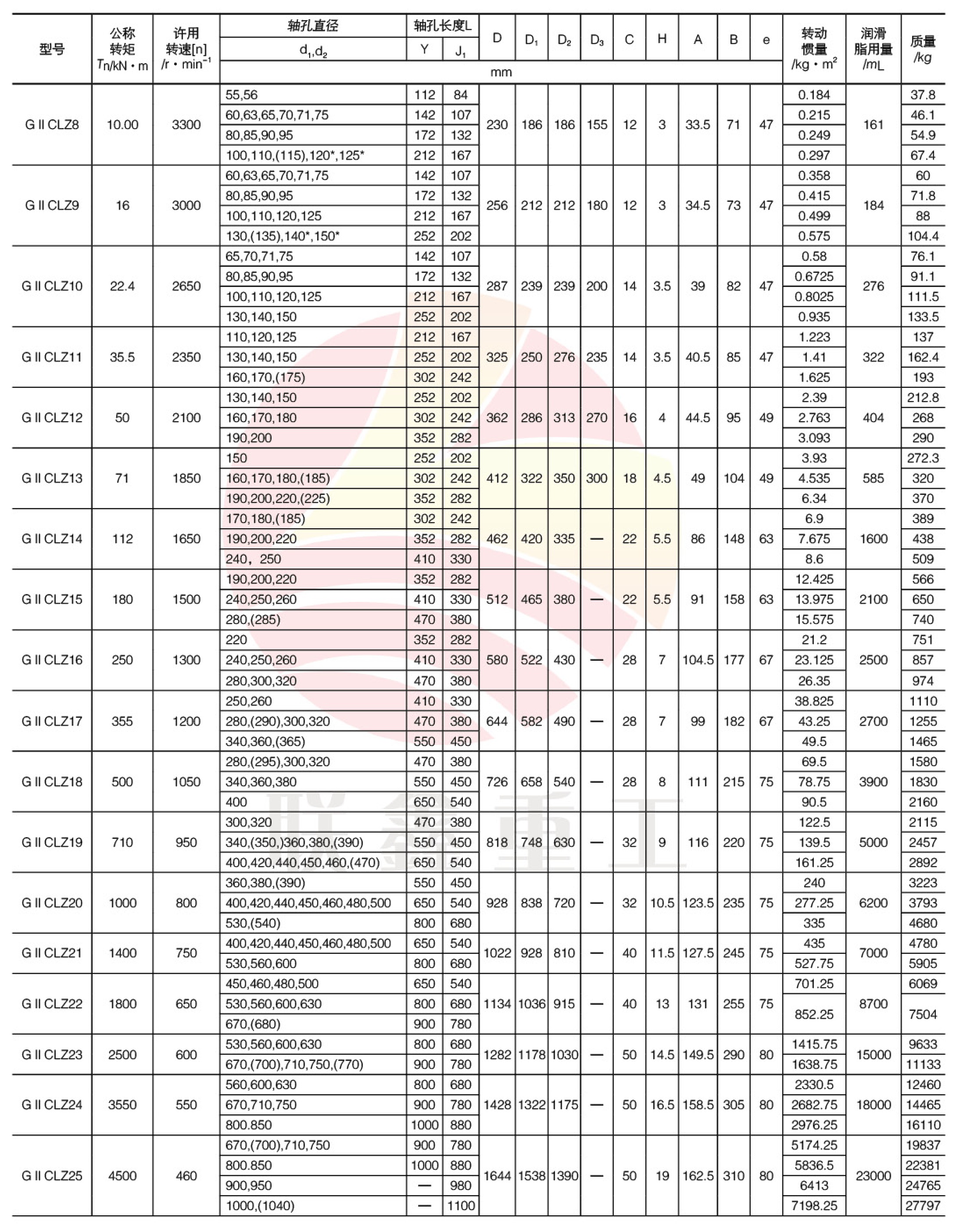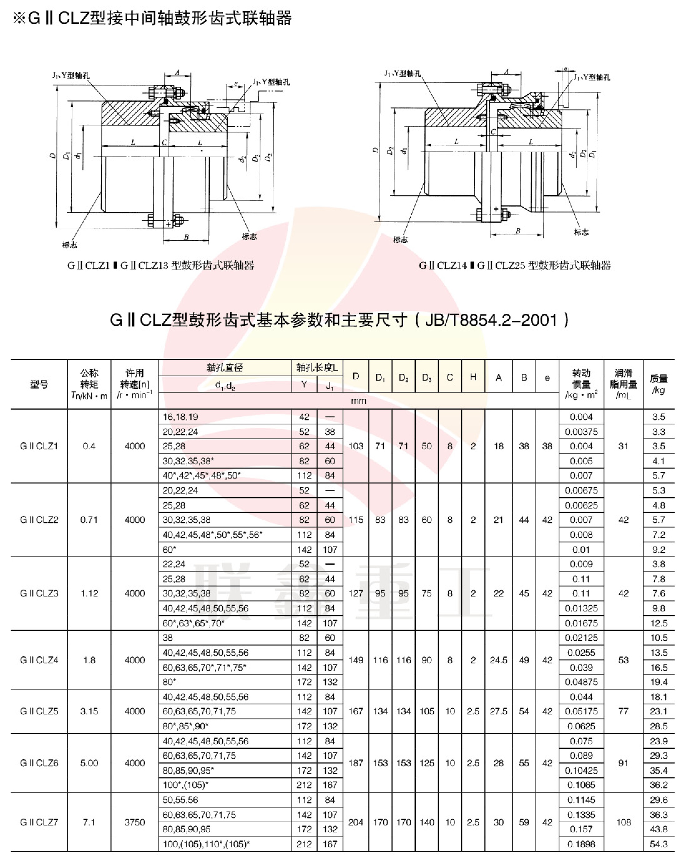 GIICLZ型鼓形齒式聯軸器 特點及應用場合:具有少量軸線偏移補償性能,不能緩沖、減振。外形尺寸小,理論上傳遞轉矩大,需要潤滑、密封,但噪聲較大、價格貴,用于聯接水平兩同軸線軸系傳動。用于低速、重載工況條件下聯接水平兩同軸線,如冶金機械、重型機械等。不適用于高速、高精度的軸系傳動,起動頻繁、正反轉多變的工況不宜采用。