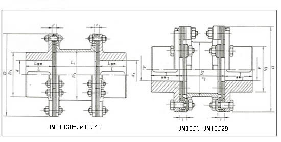 Features and application of JMIIJ diaphragm coupling: Compared with flexible joints of metal elastic components, it has high mechanical strength, large bearing capacity, light weight, small size, high transmission efficiency and high transmission accuracy, and good reliability. Easy to remove and so on. Suitable for medium, high speed and large torque shaft drive. Compared with the drum-shaped gear coupling, it has no relative sliding, no lubrication, long service life, no noise, simple structure and so on. It can partially replace the drum-shaped toothed auxiliary device. Not affected by temperature and oil. It has the characteristics of acid resistance, alkali resistance and corrosion resistance. It can be used in high temperature, low temperature and working conditions with oil, water and corrosive media. It is suitable for shafting transmission with little change in load of various mechanical devices. It is extremely versatile and has been widely used in industrialized countries. It is a high-performance flexible coupling 重點 which is mainly promoted and applied in China. High-precision diaphragm coupling can be used for High speed conditions. Compared with the toothed coupling, the diaphragm coupling has no relative sliding, no lubrication, no sealing, no noise, no maintenance, and is convenient to manufacture. It can partially replace the gear coupling. The diaphragm coupling has been widely used in industrialized countries in the world. In practical applications, the intermediate shaft type is generally adopted to improve the offset compensation performance of the two axes. JMI type - basic type with countersink; JMIJ type--with countersunk and intermediate shaft type; JMII type - no counterbore basic type; JMIIJ type - no countersinking intermediate shaft type; ![]() ![]() |