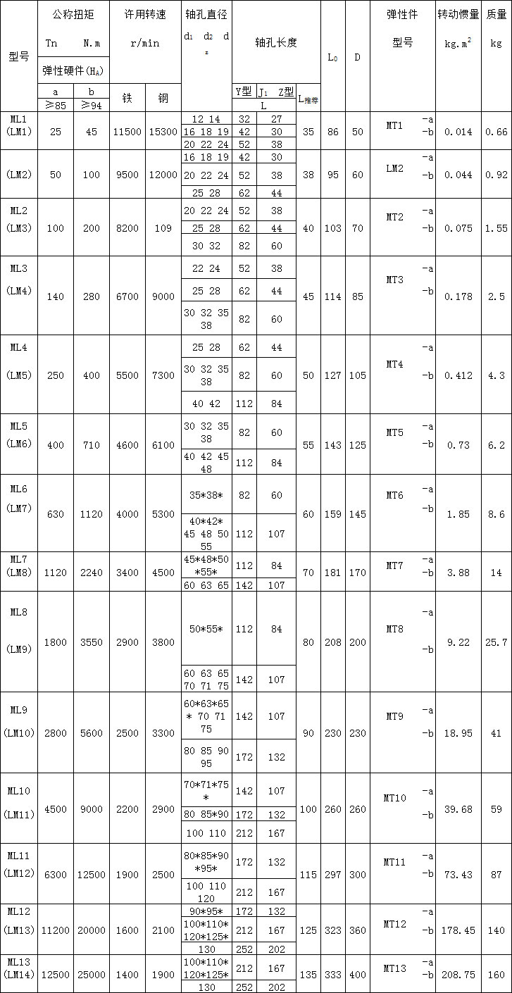 ML(LM)型梅花形彈性聯軸器的參數及主要尺寸:(GB/T 5272-2002) mm