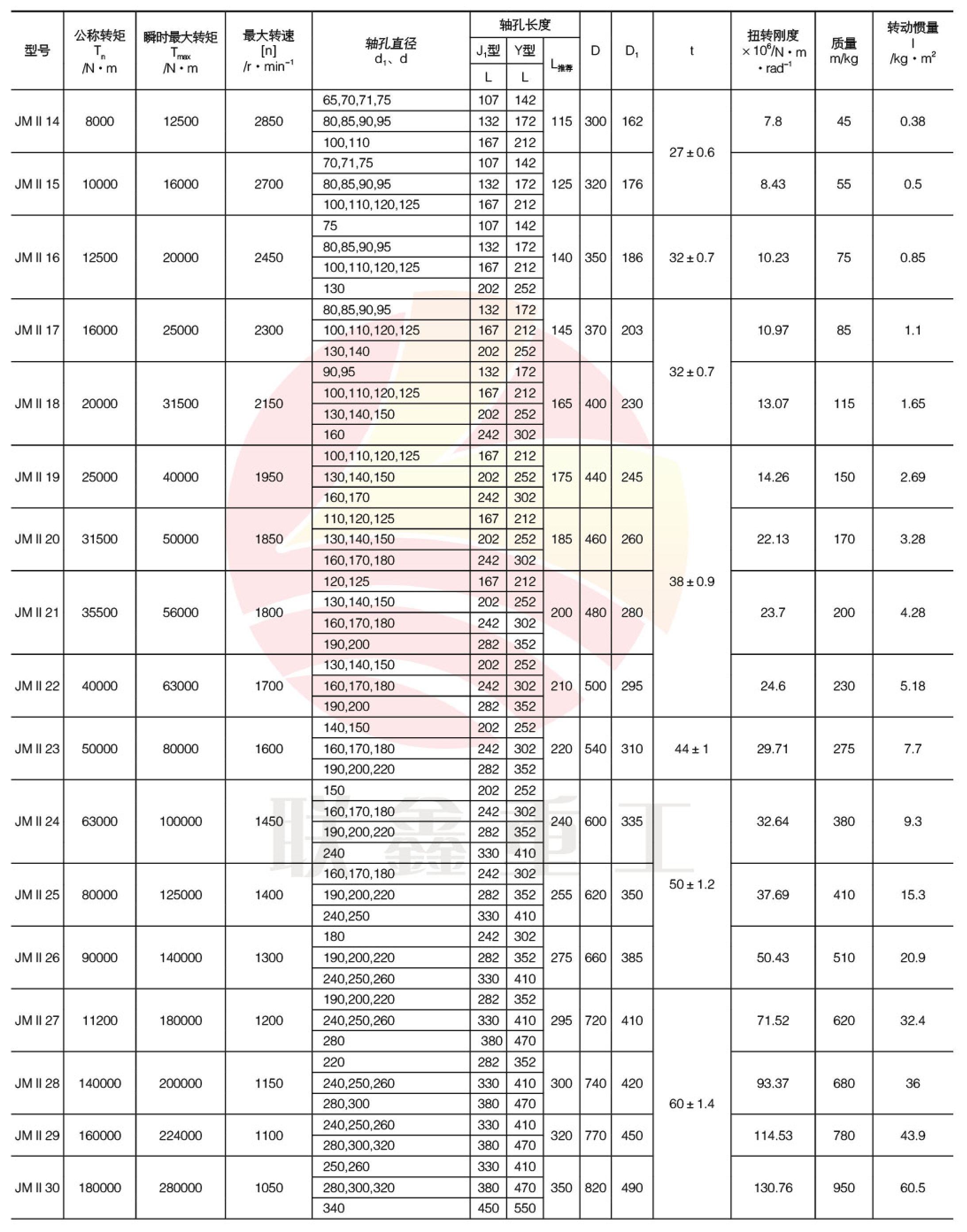 JMⅡ型膜片聯軸器 特點及應用場合:與金屬彈性元件撓性聯軸器相比,具有機械強度高,承載能力大、質量輕結構尺寸小、傳動效率和傳動精度高,可靠性好、裝拆方便等特點。適用于中、高速、大轉矩軸系傳動。與鼓形齒式聯軸器相比,具有無相對滑動,不需潤滑,使用壽命長、無噪聲、結構簡單等特點.可部分代替鼓形齒式聯輔器。不受溫度和油污影響。具有耐酸、堿,防腐蝕的特點。可用于高溫、低溫和有油、有水和腐蝕介質的工況環境.適用于各種機械裝置載荷變化不大的軸系傳動,通用性極強,工業發達國家已普遍采用,是我國重點推廣應用的高性能撓性聯軸囂,高精度膜片聯軸器可用于高速工況。膜片聯軸器與齒式聯軸器相比,沒有相對滑動,不需要潤滑、密封,無噪聲,基本不用維修,制造較方便,可部分代替齒式聯軸器。膜片聯軸器在工業發達國家應用已很普遍,在實際應用中一般采用接中間軸型,以提高兩軸線偏移補償性能。